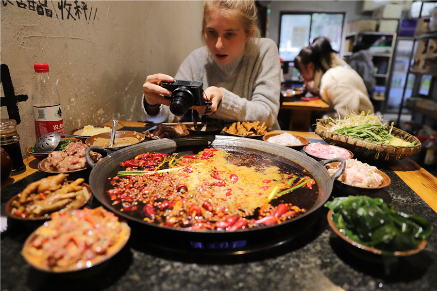 Amy takes photos of a hotpot in Chongqing, Southwest China, on Feb 13, 2019. [Photo/Xinhua]