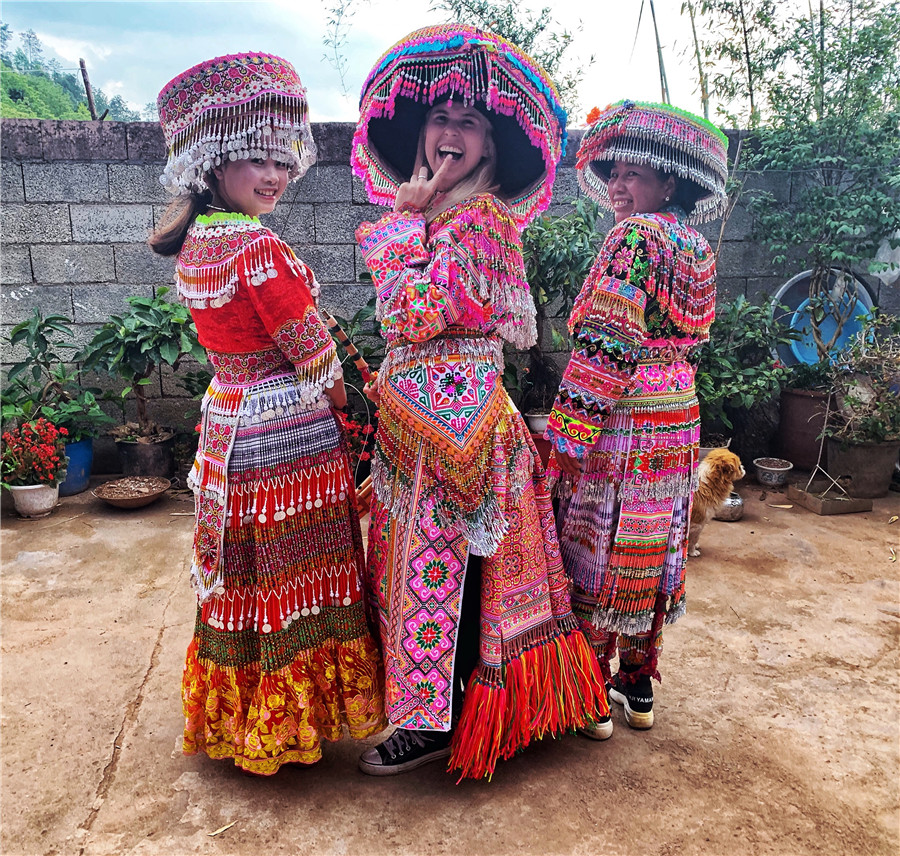 Amy, center, poses for a photo with Miao minority women in Southwest China's Yunnan province, on April 8, 2019. [Photo/Xinhua]