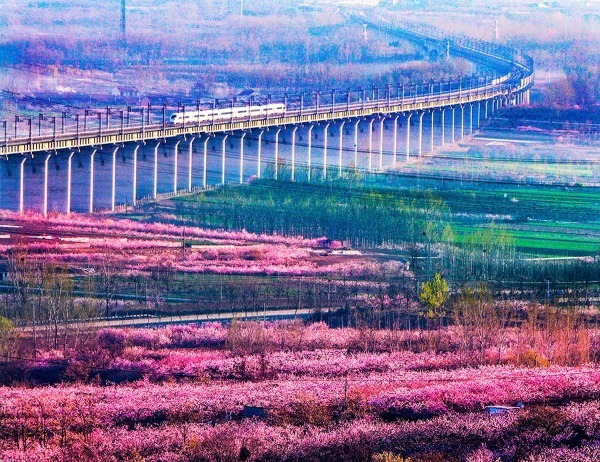 A high-speed train moves past fields of flowers in a section of the Qingdao-Yancheng railway. [Hou Yan/For chinadaily.com.cn]