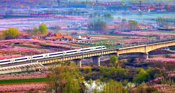 A high-speed train moves past fields of flowers in a section of the Qingdao-Yancheng railway. (Zheng Liangguo/For chinadaily.com.cn)