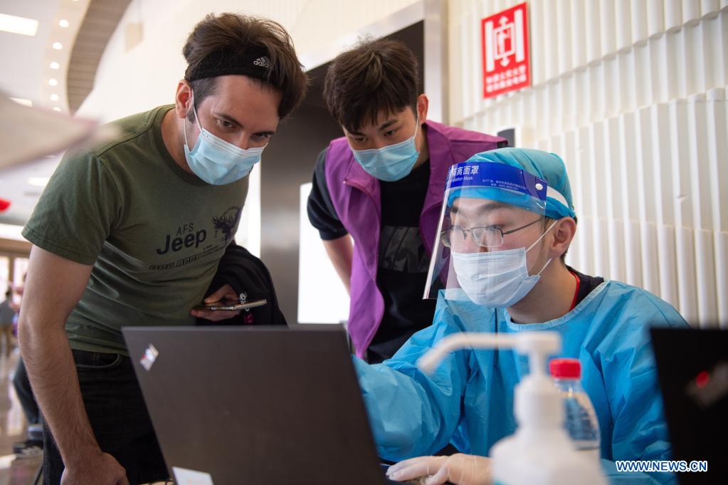 A foreign recipient (L) gets registered for a dose of Sinovac COVID-19 vaccine at a vaccination site in Tsinghua University, Beijing, April 3, 2021. [Xinhua/Chen Zhonghao]