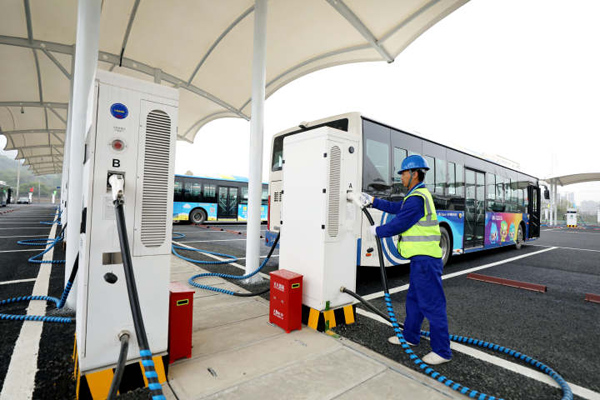 A worker charges an electric bus at China's largest charging station in Gongshu district, Hangzhou on March 31. [Photo/zjol.com.cn]