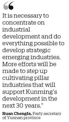 "It is necessary to concentrate on industrial development and do everything possible to develop strategic emerging industries. More efforts will be made to step up cultivating pillar industries that will support Kunming's development in the next 30 years," said Ruan Chengfa, Party secretary of Yunnan province, at a recent conference.