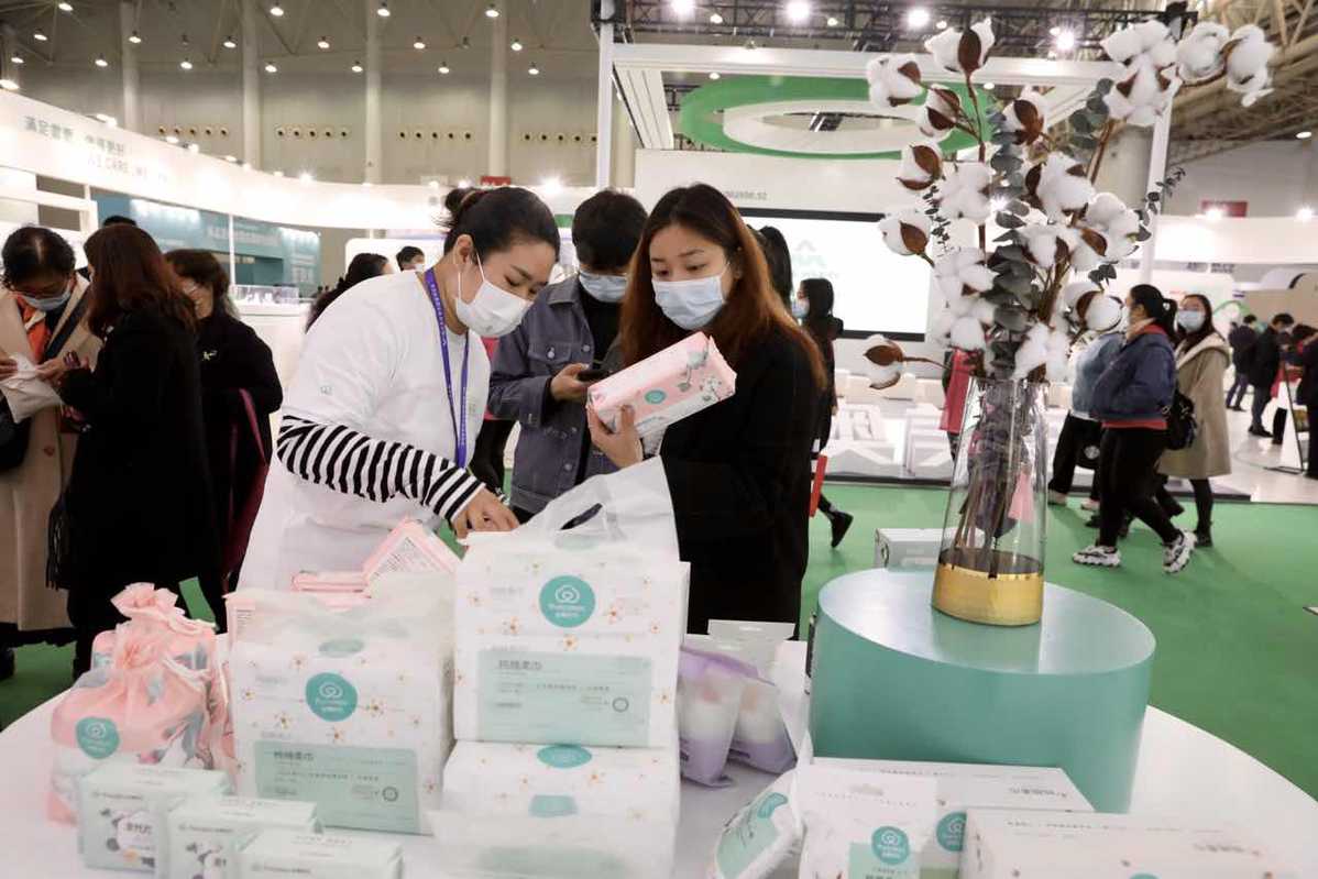 Visitors learn about products made of cotton from Xinjiang Uygur autonomous region at the World Health Expo in Wuhan, Central China's Hubei province on April 8, 2021. [Photo by Zhu Xingxin/chinadaily.com.cn]