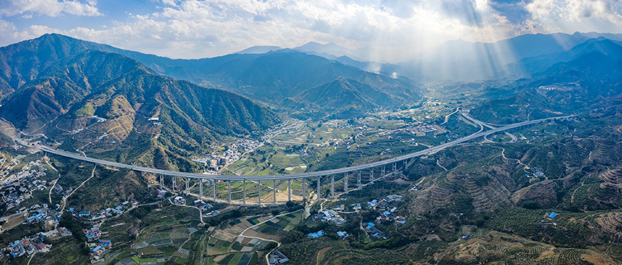 A bridge for the Panzhihua-Dali Expressway pans majestically across the landscape in Southwest China's Sichuan province, on Dec 6, 2020 . At 41 kilometers long, the expressway connects Panzhihua in Sichuan province and Dali in neighboring Yunnan province. It opened to traffic last year, and is an important tourist corridor between Sichuan and Yunnan to promote the interconnection between the two provinces and facilitate economic development along the route. [Photo/Xinhua]