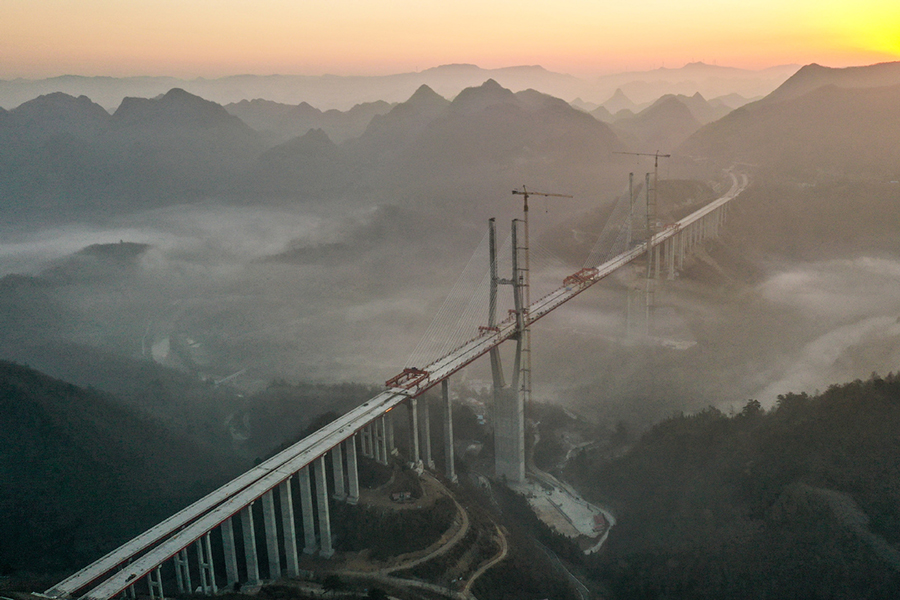 Sections of a 1.72-kilometer suspension bridge for the Duyun-Anshun Expressway are joined in Guiding, Southwest China's Guizhou province, on Jan 18, 2021. This marks a key step for the 276-km expressway, the largest road project in the mountainous province. The expressway is expected to open in June. [Photo/Xinhua]