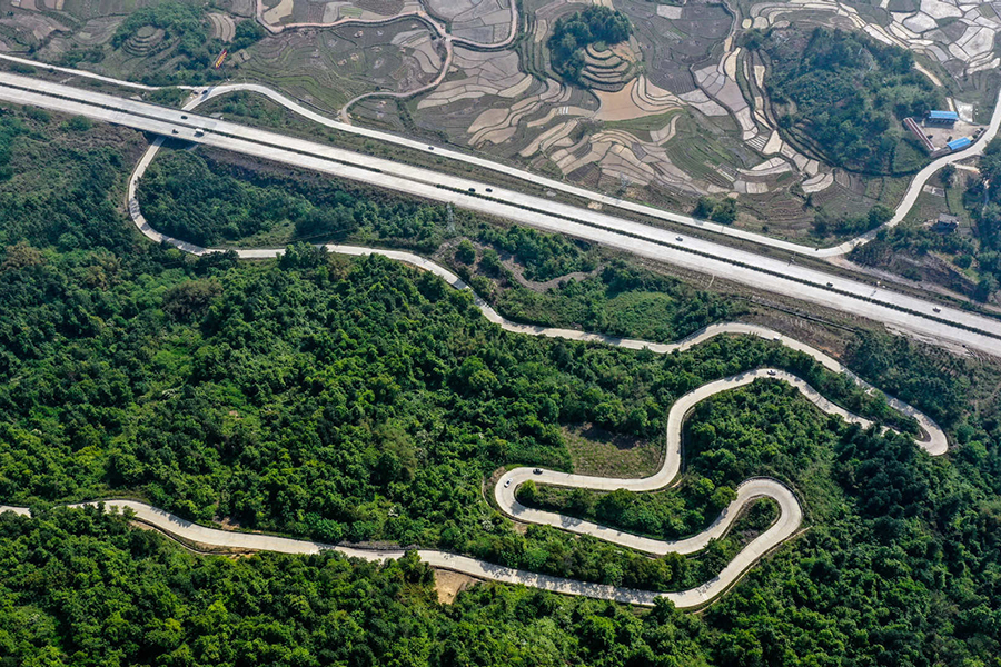 Twisting and turning through lush greenery, a section of expressway from Sanjiang Dong autonomous county to Liuzhou city in South China's Guangxi Zhuang autonomous region stands out in an aerial photo, on April 15, 2020. The expressway provides a convenient channel for local agricultural products to be sent from remote mountains to cities. Guangxi has gradually formed a road network with expressways, national-level roads, provincial-level roads and rural roads, which provide strong support for local economic development and poverty alleviation. [Photo/Xinhua]