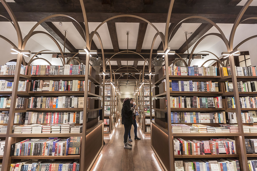 As the original building has arch-shaped windows, the bookstore also adopted the arch shape for its bookshelves. Informative pictures of the history of the building and a map dating back to Shanghai in the Republic of China (1912-49) are printed on the glass walls protecting the Corinthian pillars to create a "history museum" atmosphere.