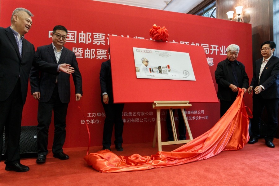 A first-day envelop featuring legendary stamp designer Shao Bolin is unveiled at the opening of the new themed post office. [Photo by Jiang Dong/China Daily]