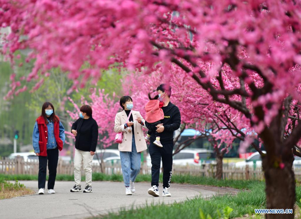 Tourists enjoy flowers at Huangtaishan Park in Qian'an city, North China's Hebei province, April 11, 2021. [Photo/Xinhua]