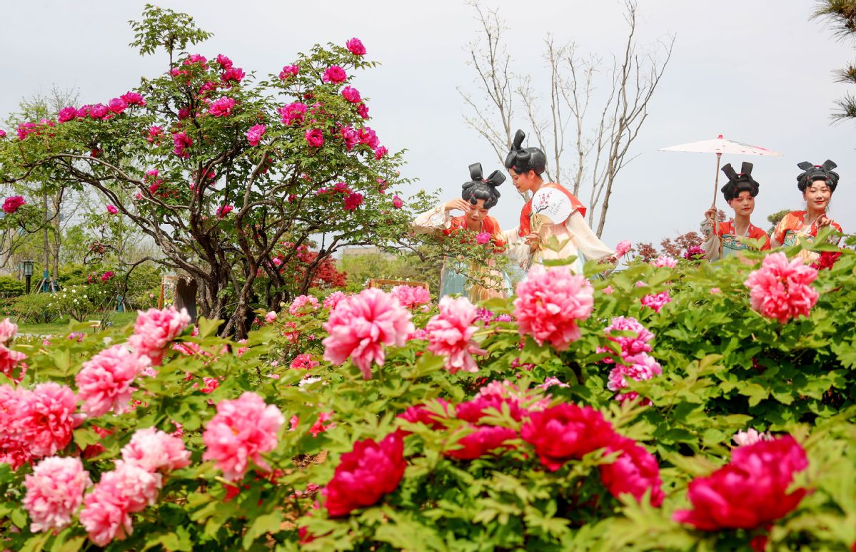 Visitors dressed in traditional Han clothing of the Tang Dynasty enjoy the peony flowers at Jiuzhouchi Scenic Spot in Luoyang, Henan province. [Photo by Zeng Xianping/for chinadaily.com.cn]