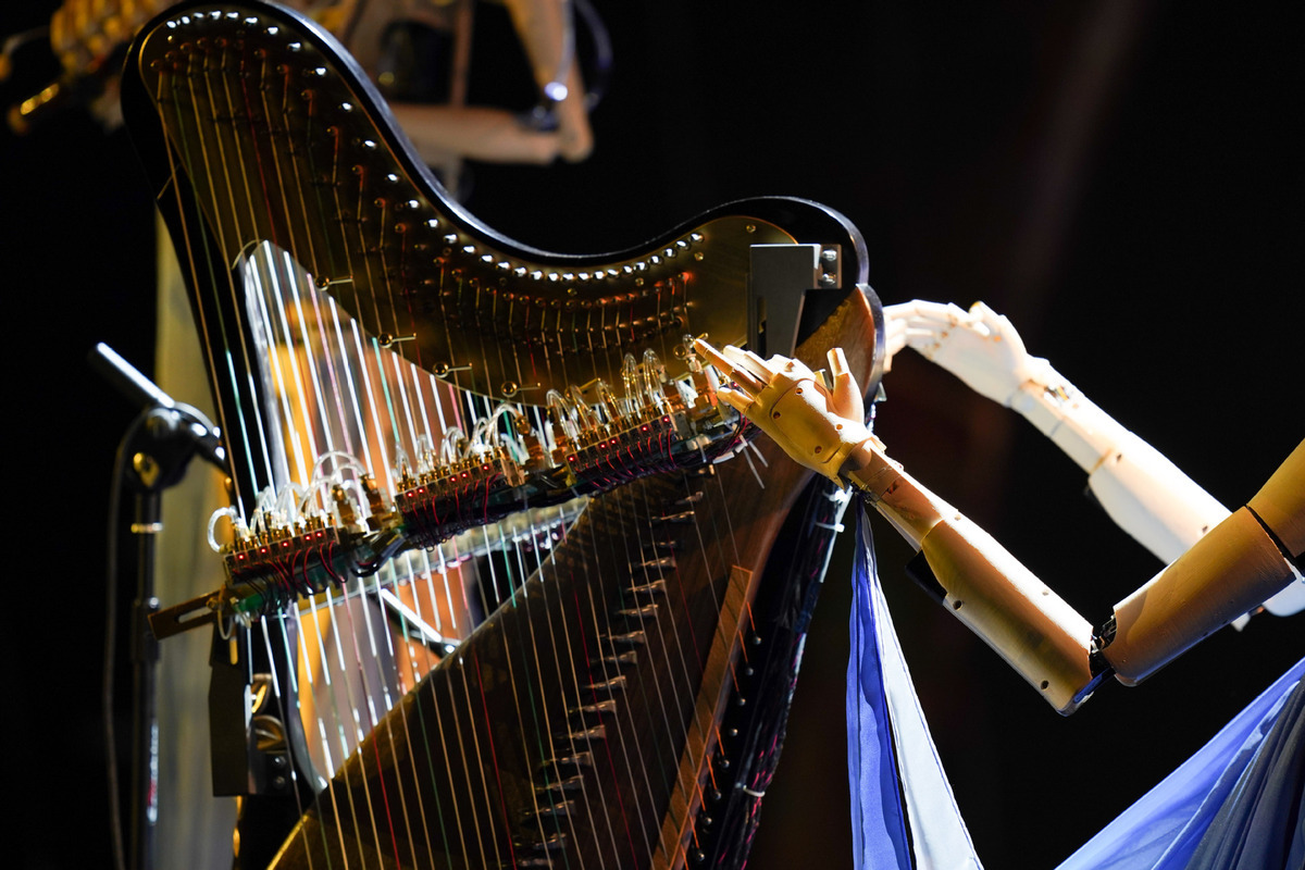 A humanoid robot from the Tsinghua Moja Robot Band performs Chinese musical pieces at a concert in Beijing, April 10, 2021.[Photo/Xinhua]