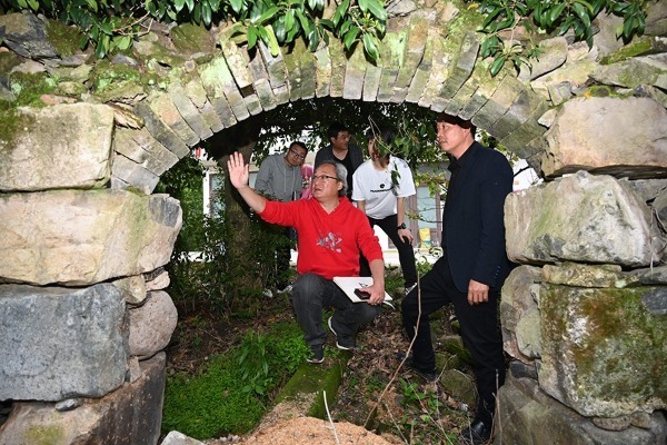 Wu Lixing shares his ideas about decorating a stone arch with villagers in Ninghai, Zhejiang province. [Provided to chinadaily.com.cn]