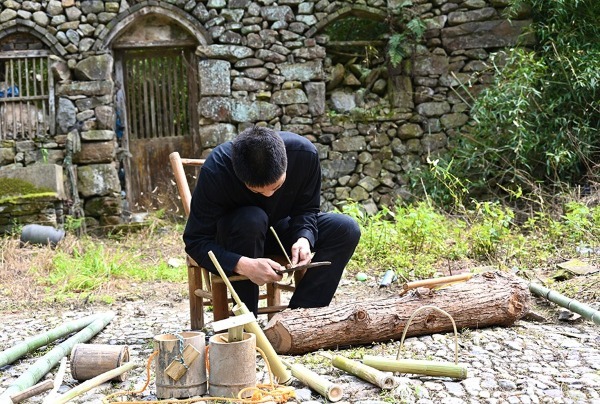 Pan Kangan makes a bamboo slingshot in his yard in Shimen village of Ninghai, Zhejiang province. [Provided to chinadaily.com.cn]