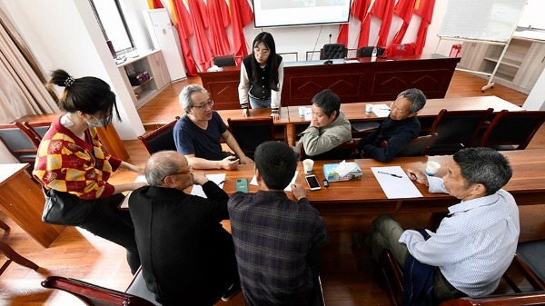 Wu Lixing (in blue T shirt) discusses the competition with residents. [Provided to chinadaily.com.cn]