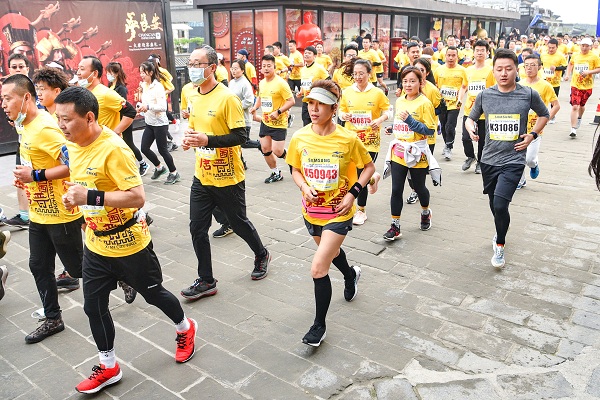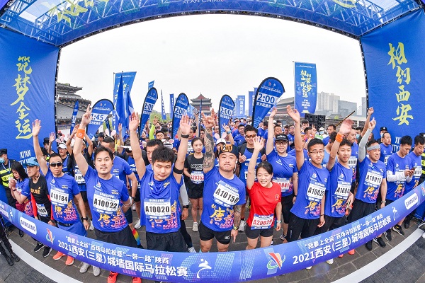 A record 4,000 runners from around the country set off from the Yongning Gate of Xi'an City Wall at 8:30 am on April 10, marking the start of the 2021 Xi'an City Wall International Marathon.