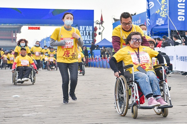 Disabled people compete in a 1-km race with the help of volunteers during the 2021 Xi'an City Wall International Marathon. [Photo/IC]