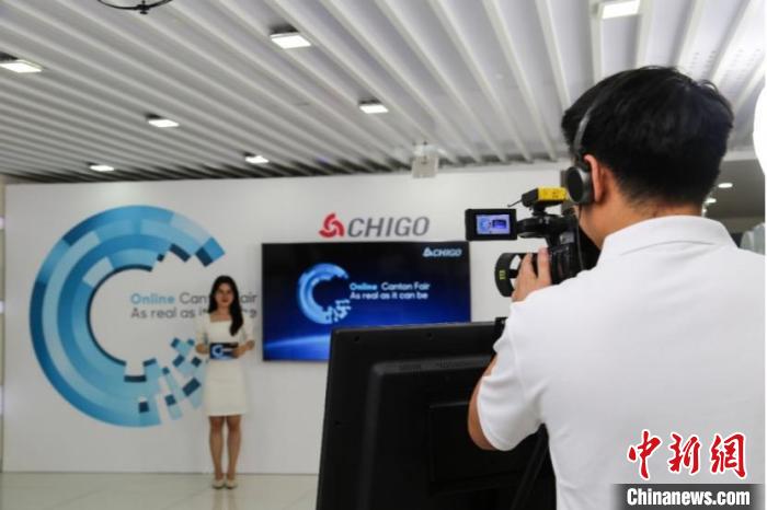 A staff member of Guangdong Chigo Air Conditioning Co Ltd introduces exhibits via livestreaming during the 129th session of the China Import and Export Fair. [Photo/Chinanews.com]