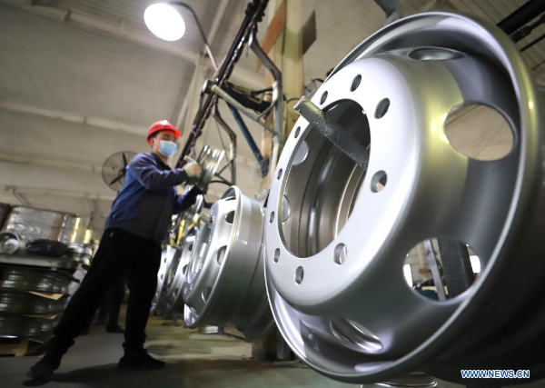 A staff member works in a workshop of a vehicle wheel hub manufacturer in Yutian county of Tangshan city, North China's Hebei province, April 16, 2021. [Photo/Xinhua]