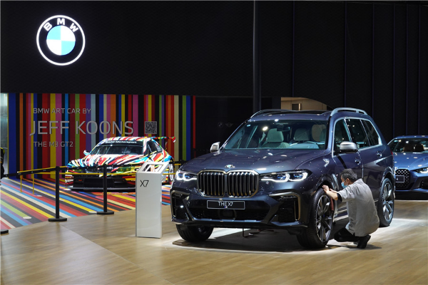 A man checks a wheel of the BMW X7 at the Shanghai Auto Show on April 18, 2021. [Photo/IC]