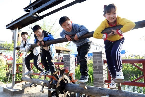 Children from Baiying county, Yangzhou ride traditional water wheels at a local scenic spot on April 4 to experience rural life. [Photo/IC]