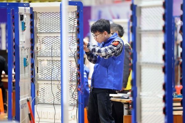 A student makes final modulations at a skills competition held in Nantong for Jiangsu vocational students on April 7. He was a participant in the application of internet of things technology. [Photo/IC]