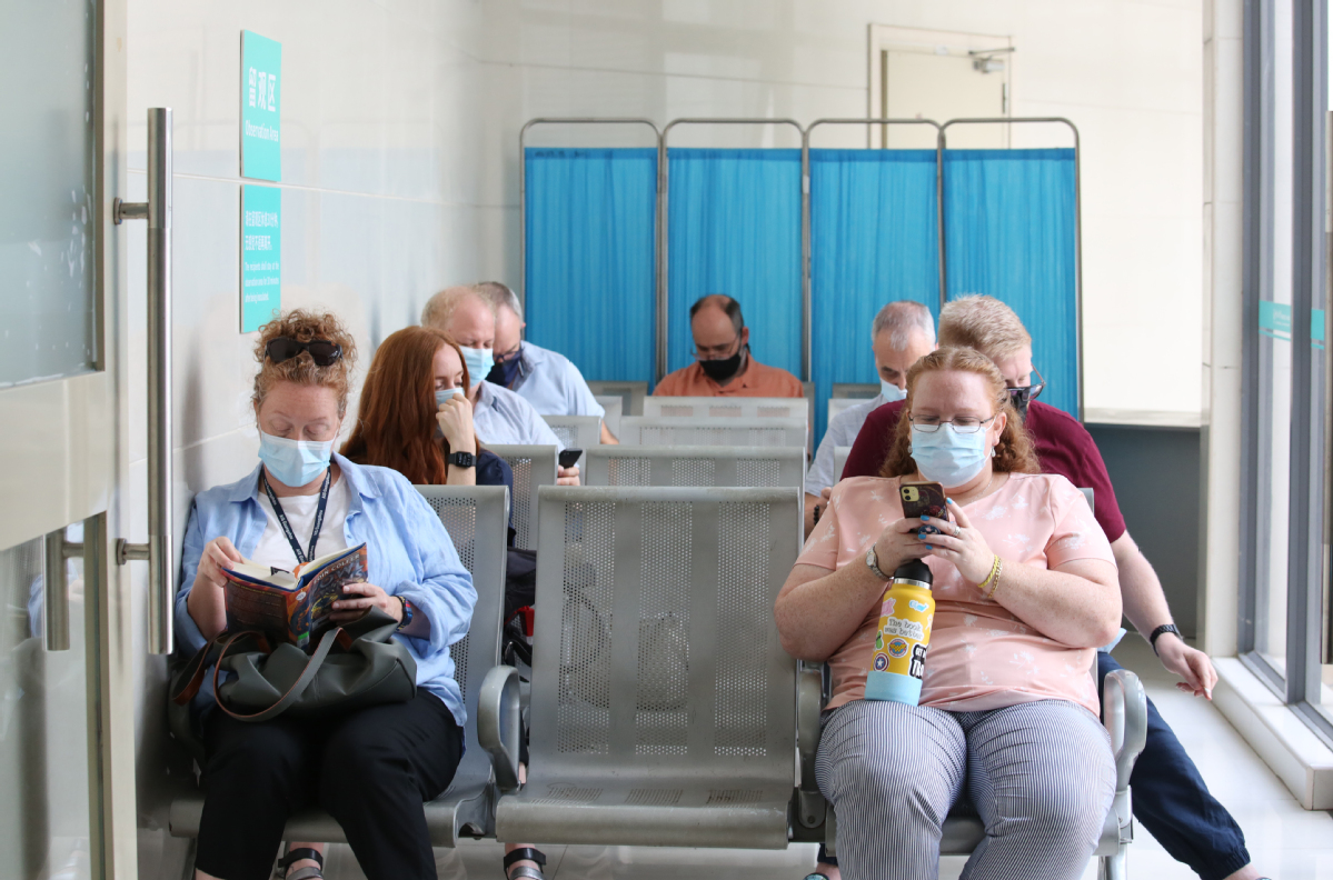 Foreign teachers from the American International School await their turn to be vaccinated. [Photo by Zheng Erqi/China Daily]