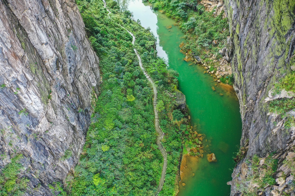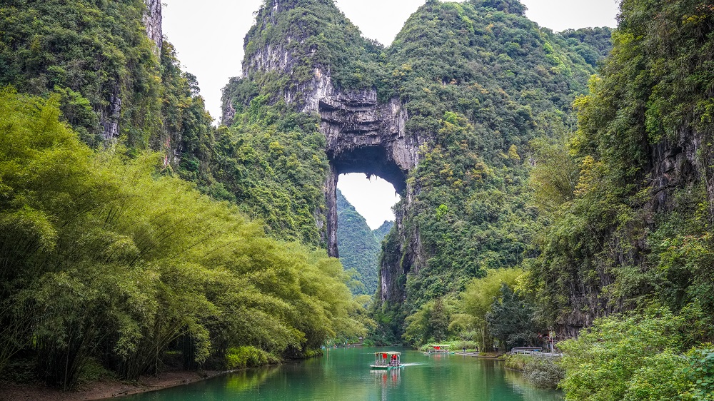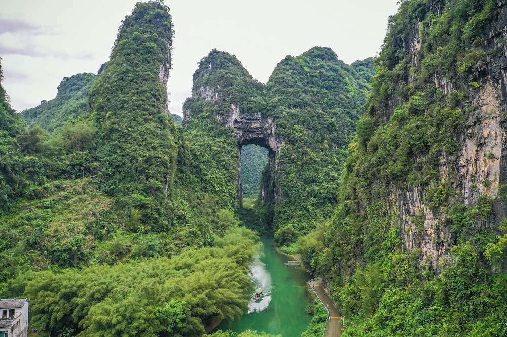 Featuring marvelous karst landscapes, a rock cliff resembling a huge arch stands out from the lush forests in Luocheng county of Hechi city, Guangxi Zhuang autonomous region. The special decorations on its top—dazzling stalactites—are also sight worthy!