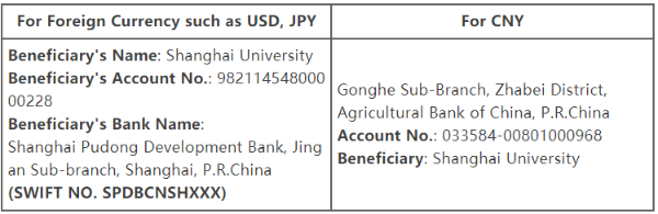2. The application fees are not refundable whether admitted or not. For information about the tuition deposit payment please refer to the attached Policies on Tuition Deposit Payment for Shanghai University International Students.