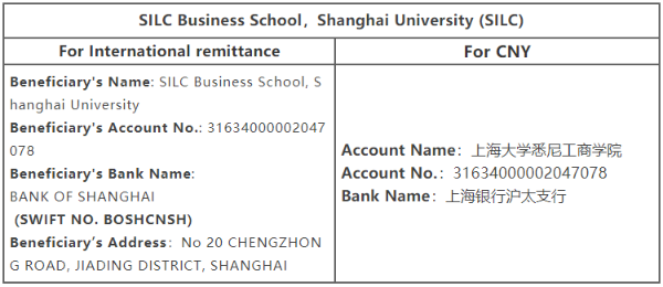 1. The tuition fee and tuition deposit for the programs of SILC Business School (SILC) should be paid to the bank account of SILC Business School (SILC).