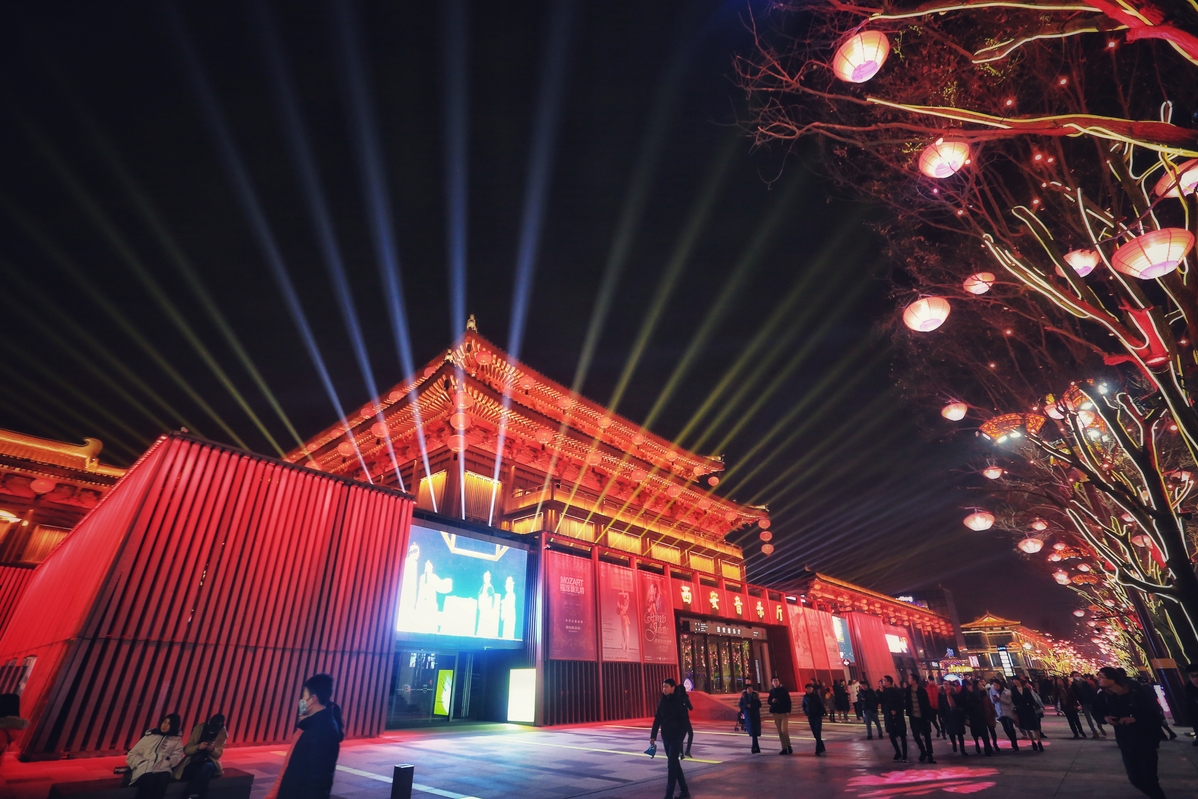 The Great Tang All Day Mall is a sightseeing and leisure area covering 650,000 square meters south of the Big Wild Goose Pagoda in Xi'an, Northwest China's Shaanxi province. The spot received 75 million visits from April to December in 2020.
