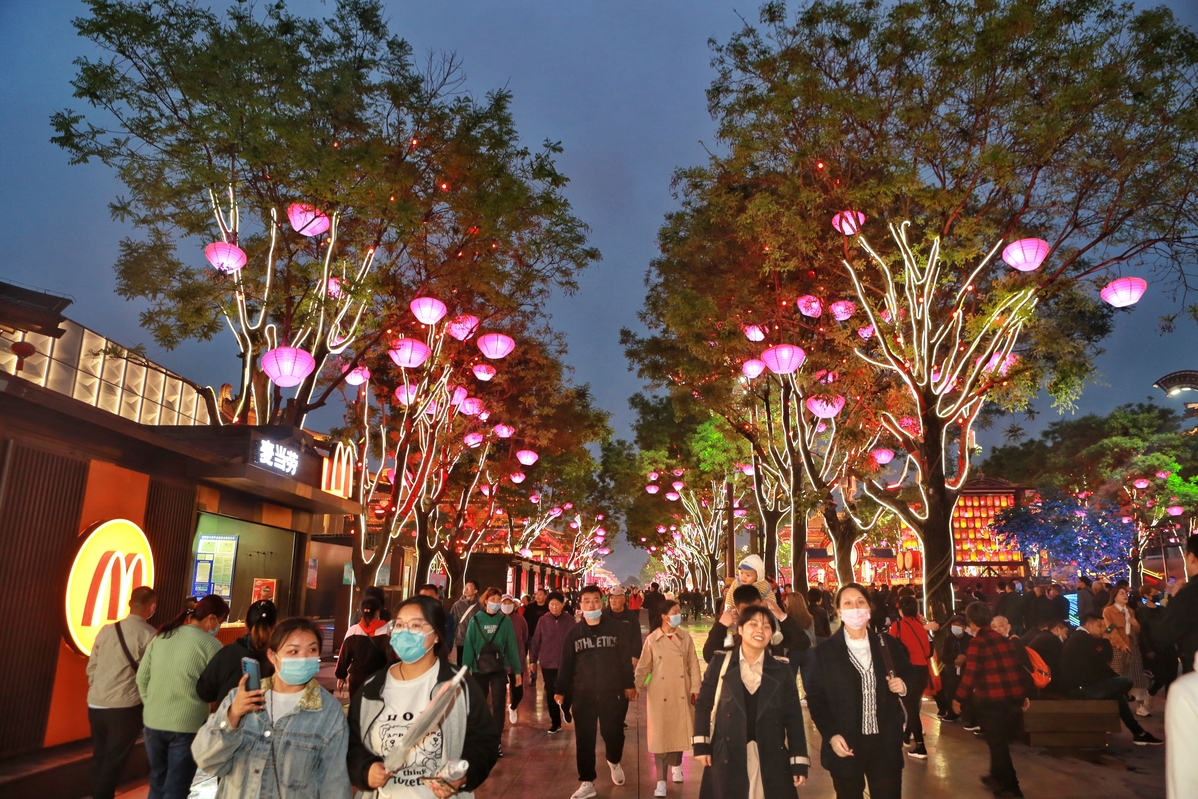 Tourists enjoy the night views at the Great Tang All Day Mall in Xi'an, Shaanxi province, on April 21, 2021. [Photo/chinadaily.com.cn]