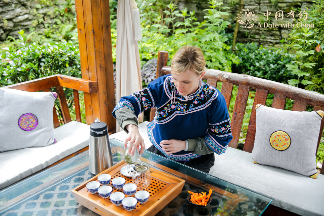 Smirnova Anzelika, an internet celebrity from Latvia, enjoys green tea in Qingyan ancient town in Guiyang, capital city of Guizhou province, April 25, 2021. [Photo/chinadaily.com.cn]