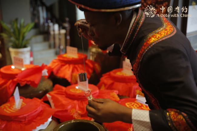 Robert Nani, a Ghanaian internet celebrity, has a taste of baijiu (Chinese white liquor) in Qingyan ancient town in Guiyang, capital city of Guizhou province, April 25, 2021. [Photo/chinadaily.com.cn]