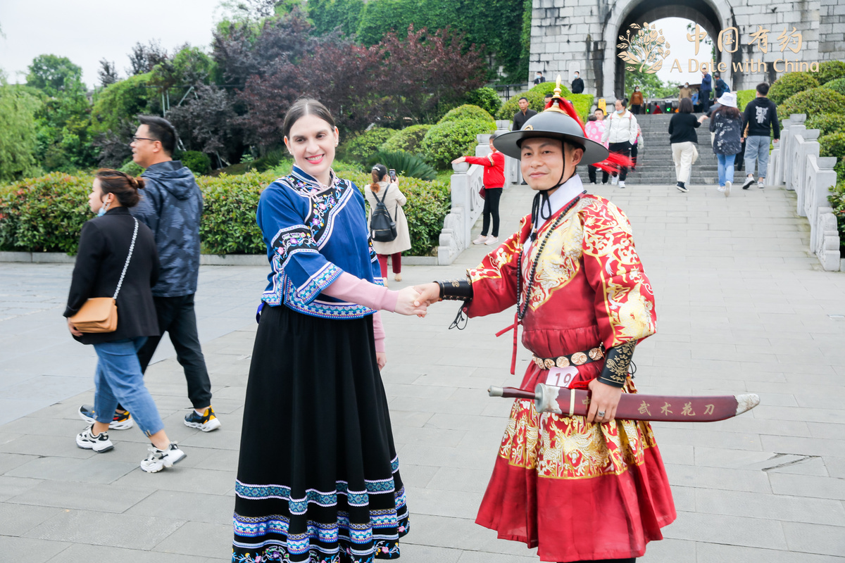 Jocelyn Eikenburg (left), an American expat, shakes hands with a performer in Qingyan ancient town in Guiyang, capital city of Guizhou province, April 25, 2021. [Photo/chinadaily.com.cn]