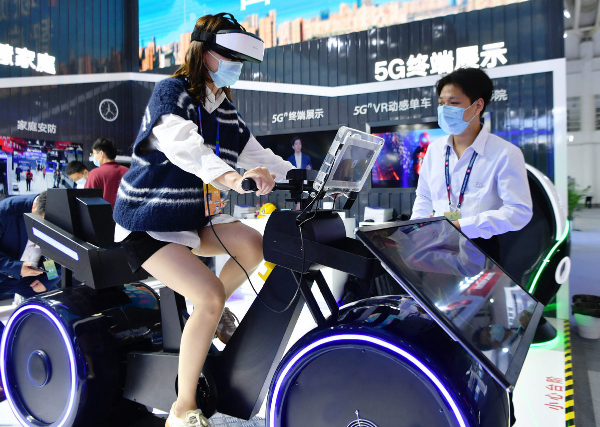 A visitor tries a VR spinning based on 5G technology at the digital achievement exhibition during the 4th Digital China Summit in Fuzhou, Fujian province, on April 25, 2021. [Photo/Xinhua]
