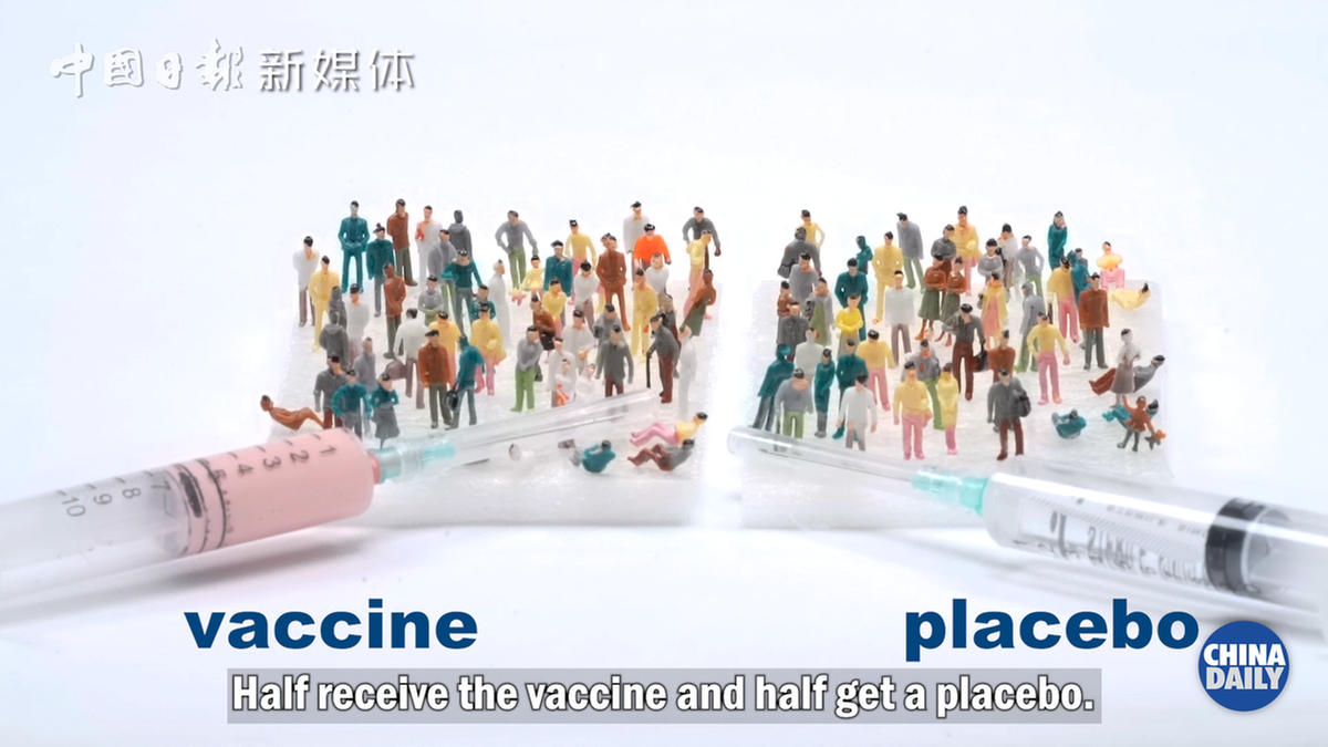 A vaccine's efficacy rate is calculated in large clinical trials and it's very complicated, but we could simply separate these tested people into two groups in this presentation. Half of them receive the vaccine and half get a placebo. They go back to living their normal lives for a period of time while scientists track their health conditions.