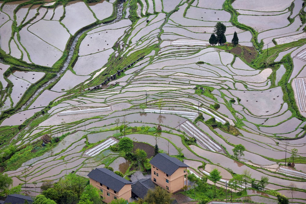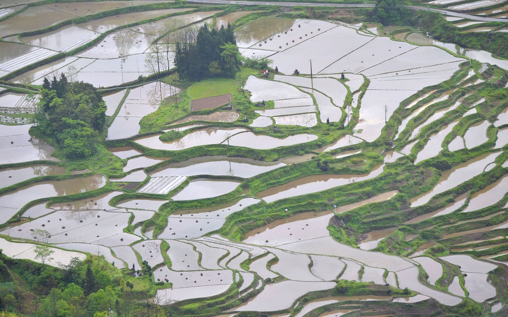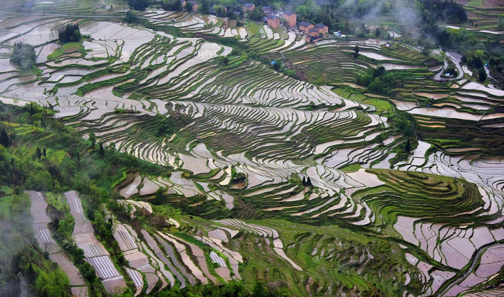 Boasting tremendous terraced-field landscapes, a Hejiayan ancient stockade village in Youyang Tujia and Miao autonomous county in Chongqing offers good views of featured Tujia ethnic buildings set in picturesque surroundings backed up by the mountain behind them, especially in spring!