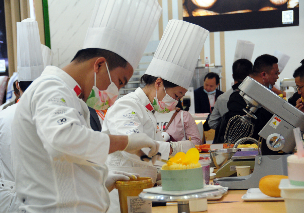Bakers make birthday cakes at an international bakery exhibition in Shanghai on April 27, 2021. [Photo/IC]