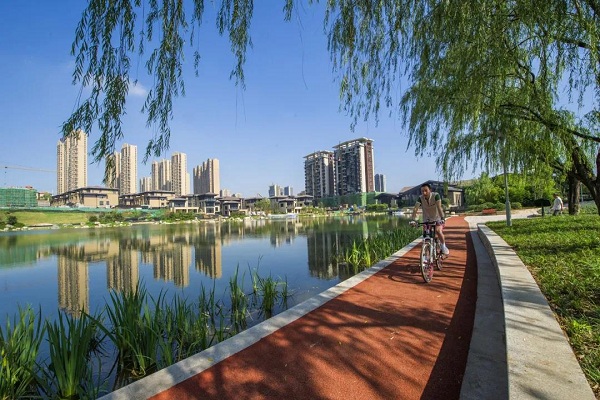 A citizen rides along a greenway in Xi'an. [Photo/Xi'an municipal government's WeChat public account]