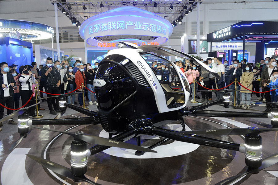 Visitors take photos of an autonomous aircraft at the digital achievement exhibition during the 4th Digital China Summit in Fuzhou, Fujian province, on April 25, 2021. [Photo/IC]