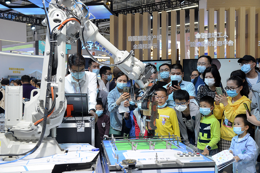 Visitors look at a mechanical arm that can assemble reinforcement at the digital achievement exhibition during the 4th Digital China Summit in Fuzhou, Fujian province, on April 25, 2021. [Photo/IC]
