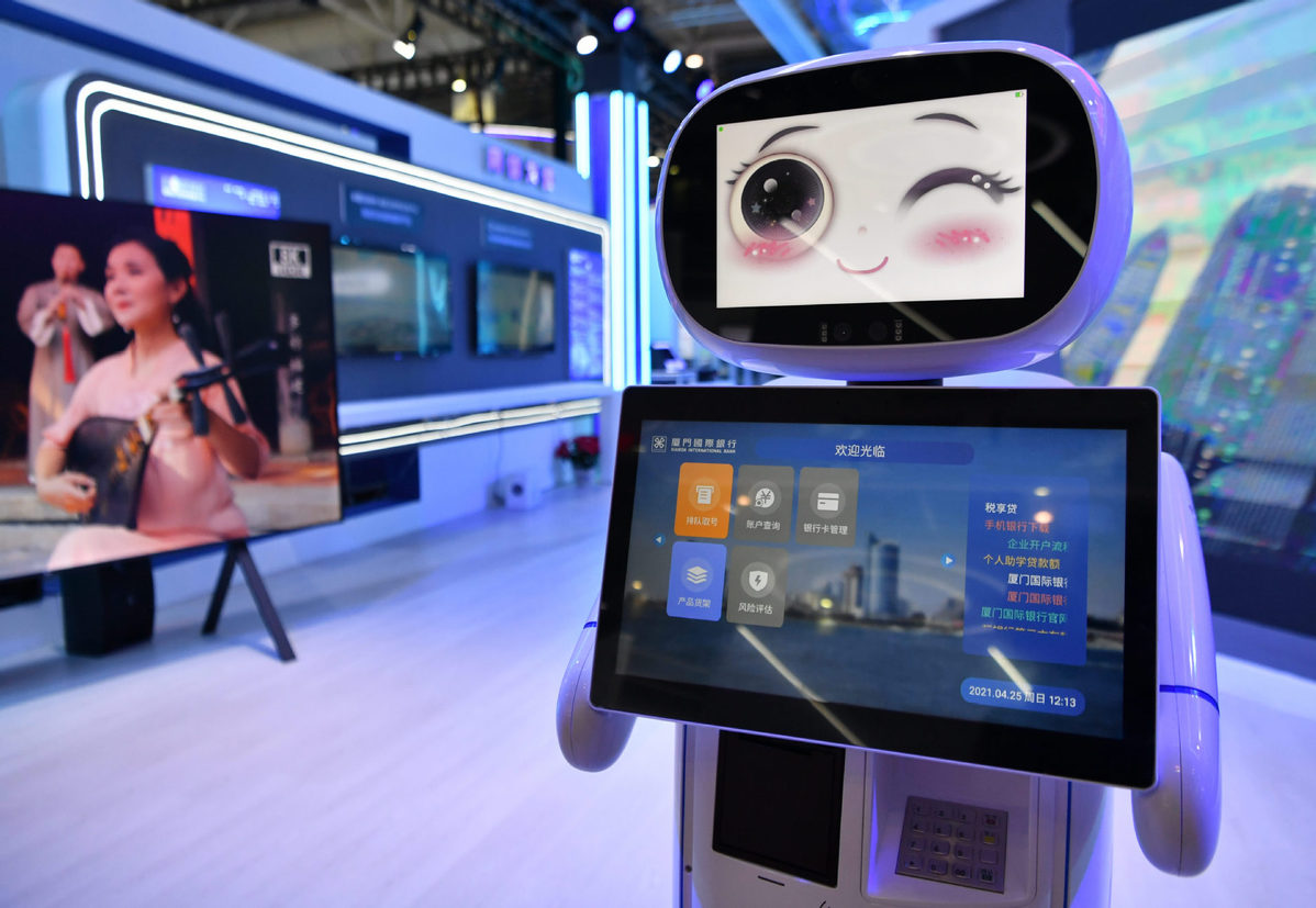A robot belonging to Xiamen International Bank is seen at the digital achievement exhibition during the 4th Digital China Summit in Fuzhou, Fujian province, on April 25, 2021. [Photo/Xinhua]