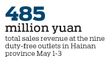 Nearly 729,000 items were sold at the nine duty-free outlets on the island between Saturday and Monday, with total sales revenue edging up to 485 million yuan ($74.92 million), up 222.79 percent and 215.24 percent on a yearly basis, respectively, according to Haikou Customs, which oversees the offshore duty-free shopping business in the province. Tourist footfalls at the duty-free shops stood at 65,400 as of Monday, up 140.23 percent over the same period a year ago, according to local Customs officials.