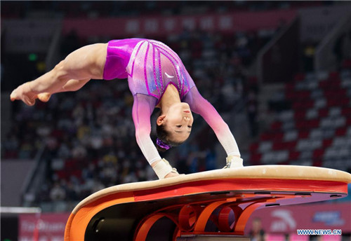 Tang Xijing of Beijing competes during the vault event of women's individual all-round final at the 2021 Chinese National Gymnastic Championships in Chengdu, southwest China's Sichuan Province, May 7, 2021. [Xinhua/Xu Bingjie]