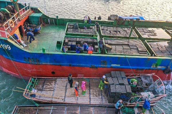 Photo taken on April 25 shows farmers in Sanggou Bay of Rongcheng, Weihai, East China's Shandong province, putting abalones brought back from East China's Fujian province into abalone breeding areas. [Photo/VCG]