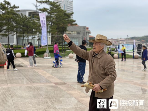 A 90 year-old man flies kites during the festival. The man has been interested in flying kites for many years and most of his kites are made by himself. [Photo/dzwww.com]