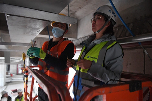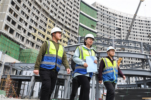 Du Xuan (C), an engineer at China Construction Third Engineering Bureau Group Co, on site at a medical complex she is responsible for in Lanzhou, Gansu Province. [Xinhua]