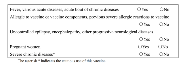 【Contraindications to vaccination】Please read instructions for contraindications to vaccination. Usually, contraindications to vaccination include: (1) those who are allergic to vaccine or vaccine components; (2) those who are suffering from acute diseases; (3) those who are in the acute bout of chronic diseases; (4) those who are feverish; (5) women during pregnancy.