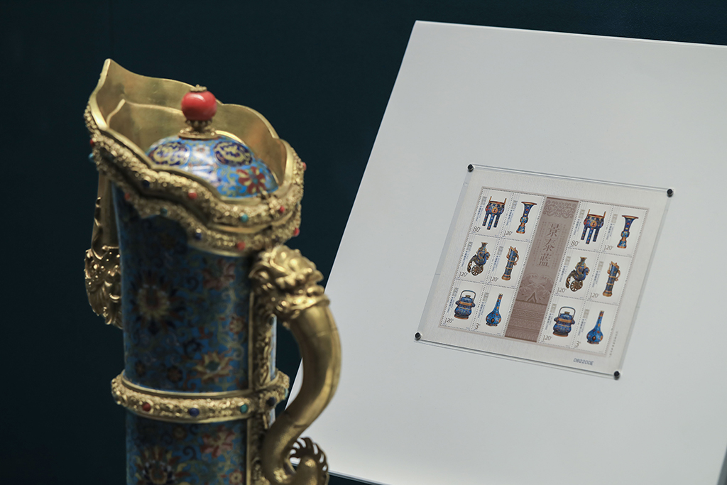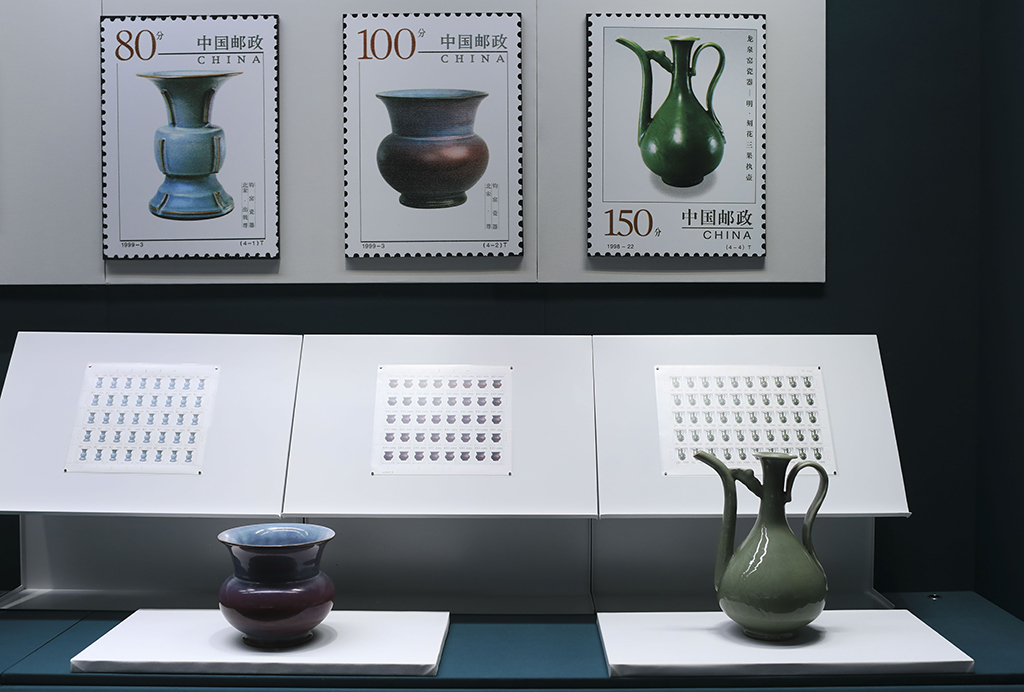 A total of 1,732 stamps in 56 sets are on show, along with 25 works from the collections, including calligraphy and paintings, jade ware, enamels, bronzes and ceramics.